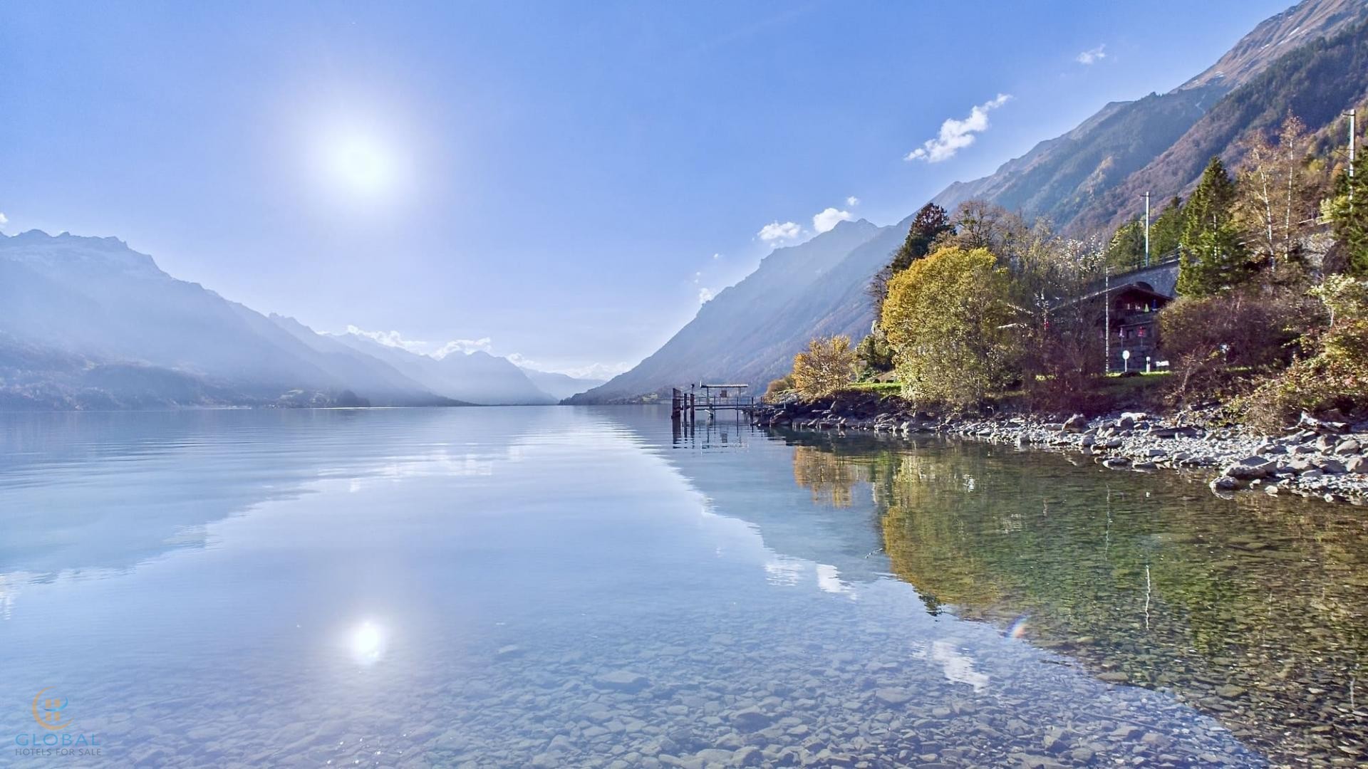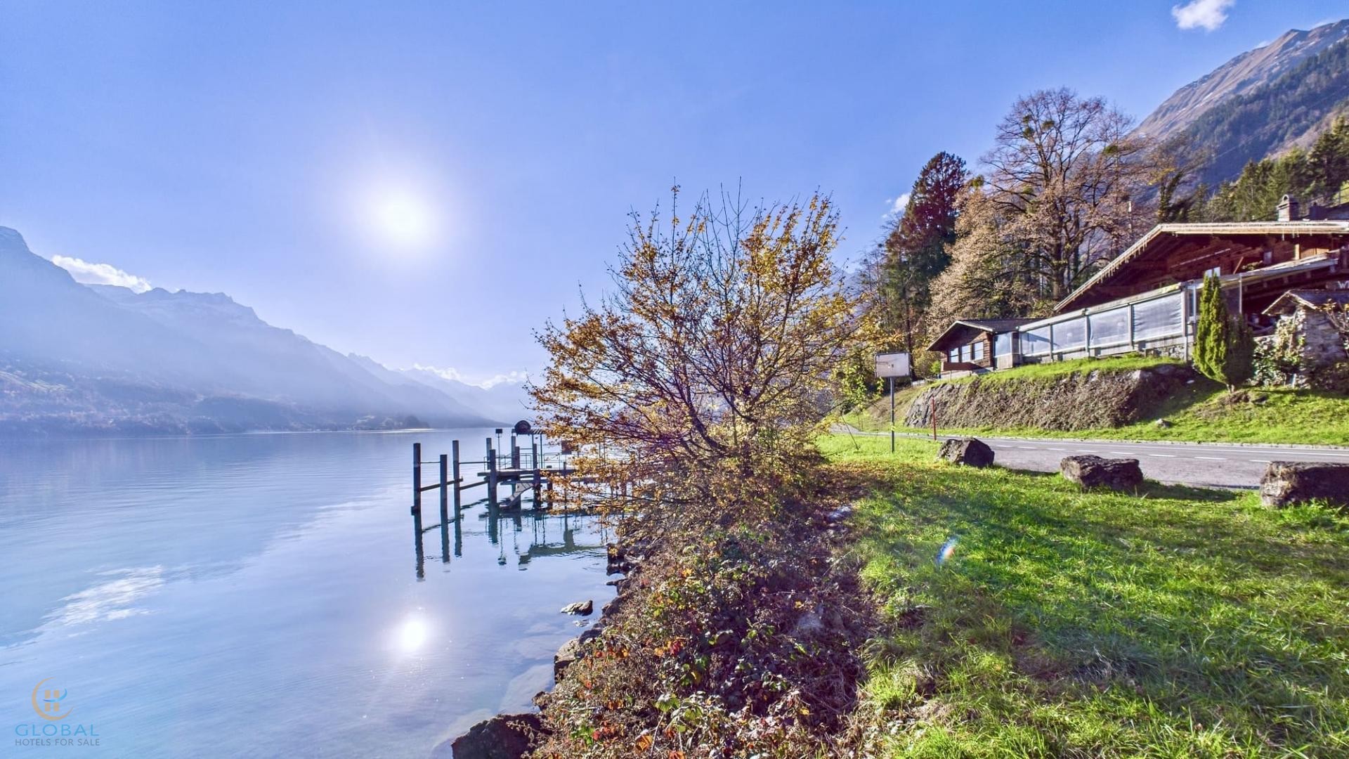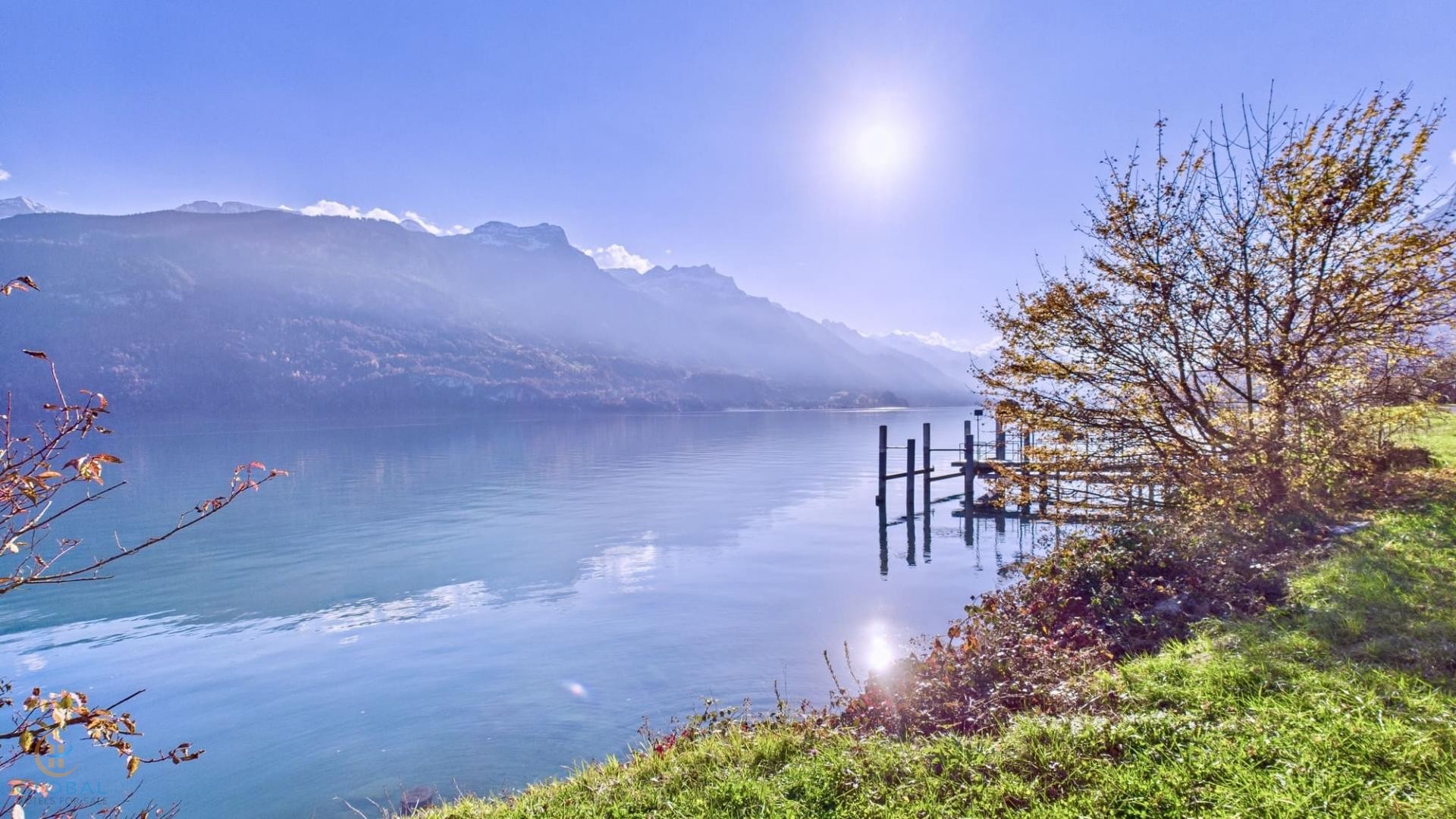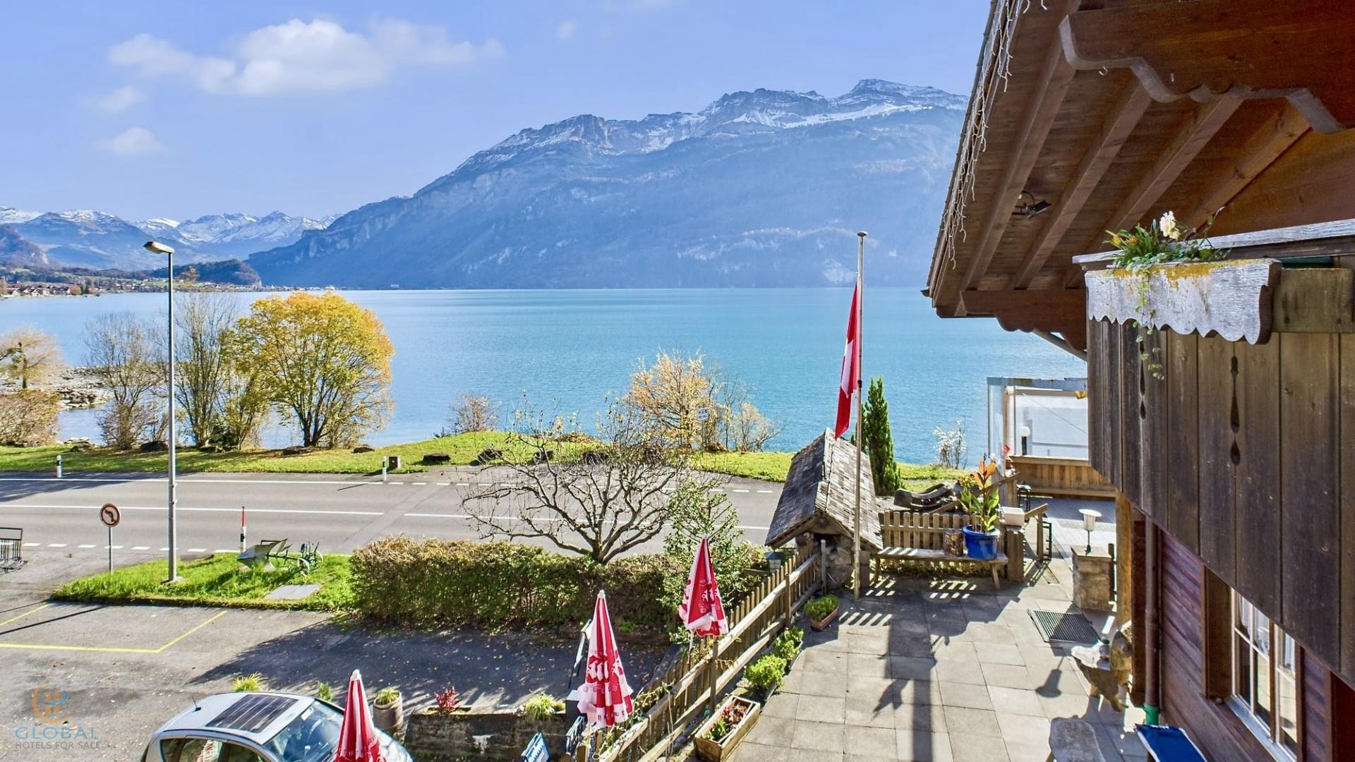 The property is lease-free, has a parking area that is rare for Brienz, and a unique boat dock on the lake shore.